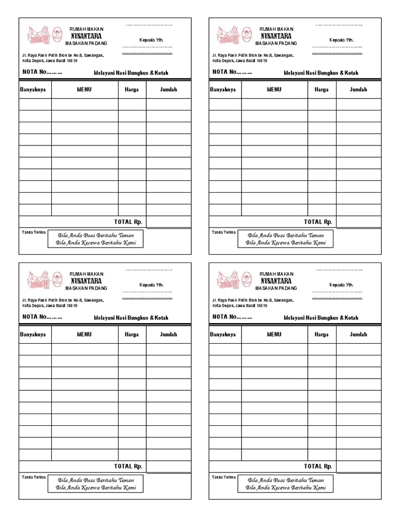 Nota rumah makan sederhana. Menyiapkan nota invoice atau faktur tagihan merupakan salah satu kebutuhan utama jika Anda sedang menjalankan usaha jual-beli maupun jasa secara profesional. Desain nota service komputer desain nota service desain nota sederhana desain nota sewa mobil desain nota sayur desain nota. Kaliurang Depok 55281 Indonesia 62 274 550000 Website Menu Add hours.